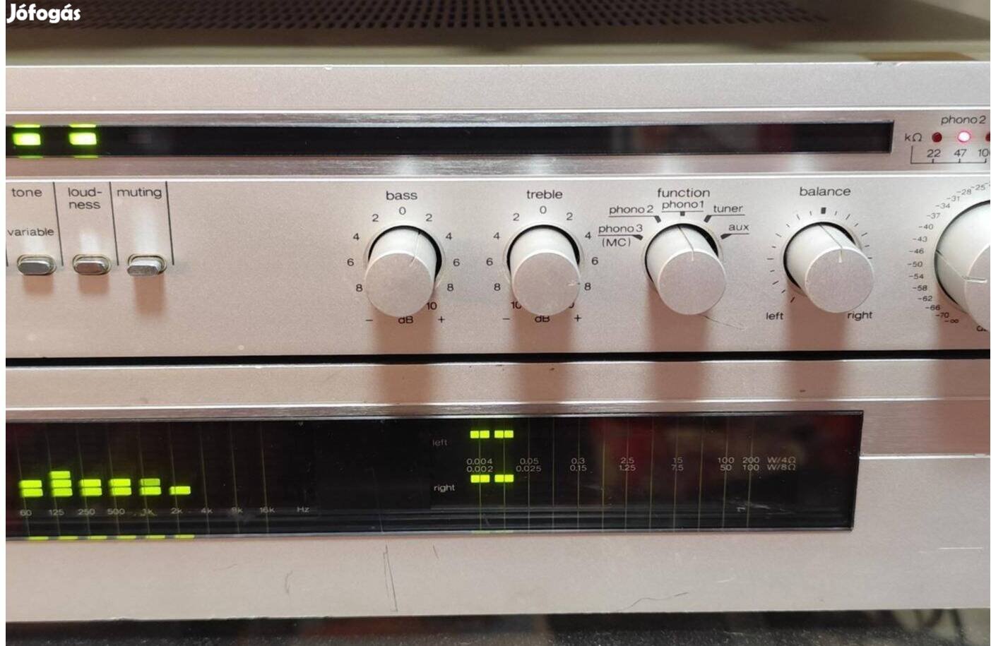 Ritka hifi előerősítő/végerősítő kombó 1981-ből. Ez volt az Optonica csúcsa akkoriban. Az Optonica a Sharp csúcskategóriás márkája volt annak idején, és ezeken a kivitelezési minőség és a dizájnesztétika kiváló. Az előerősítő jó a Moving Magnet vagy Moving Coil phono kocsikhoz, és elegendő vezérlővel és szűrővel rendelkezik, hogy a legtöbbet hozza ki a zenei forrásból. A teljesítményerősítő 14 kg-ot nyom, és csatornánként 80 W-ot 8 Ohm-ra nyom ki. A pár kiválóan működő állapotban van, és az előző tulajdonos részlegesen átrakta minőségi hangsapkákkal, ami a legfontosabb tápegységben. Ez a kombó a legtöbb hangszórót könnyedén és tisztán fogja meghajtani, rengeteg fejtérrel.