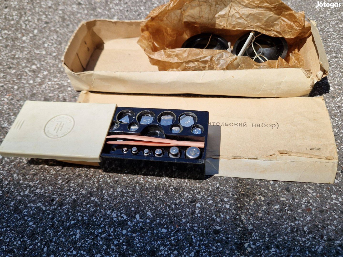 Orosz ékszermérleg dobozával eladó. A legkisebb súly hiányzik.
