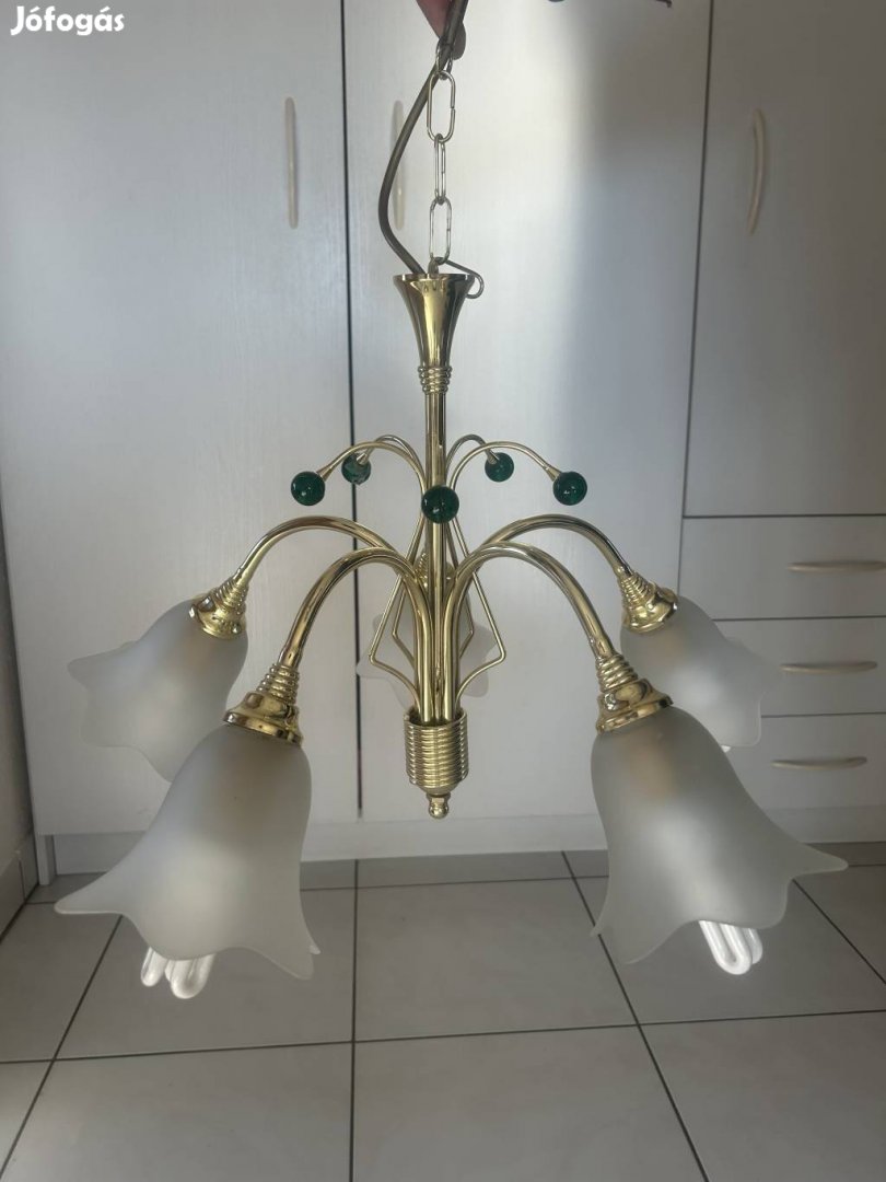 Arany színű 5 ágú mennyezeti csillár zöld gombokkal, áttetsző üveg burával