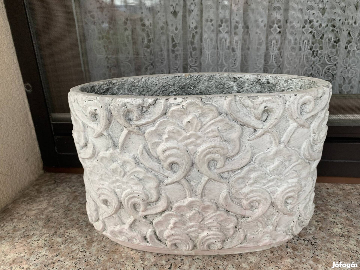 Ovális mintás kaspó, betonszürke színű, stabil.