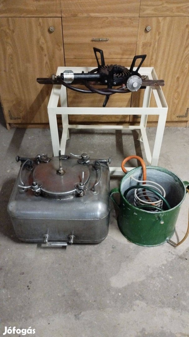 Pálinkafőző rozsdamentes 70 L tartály,+réz csőves hűtő,+maszív állvány.Ha kell hozzá a képen látható új gázzsámoly,reduktorral csővel+6000 FT-ér elvihető.