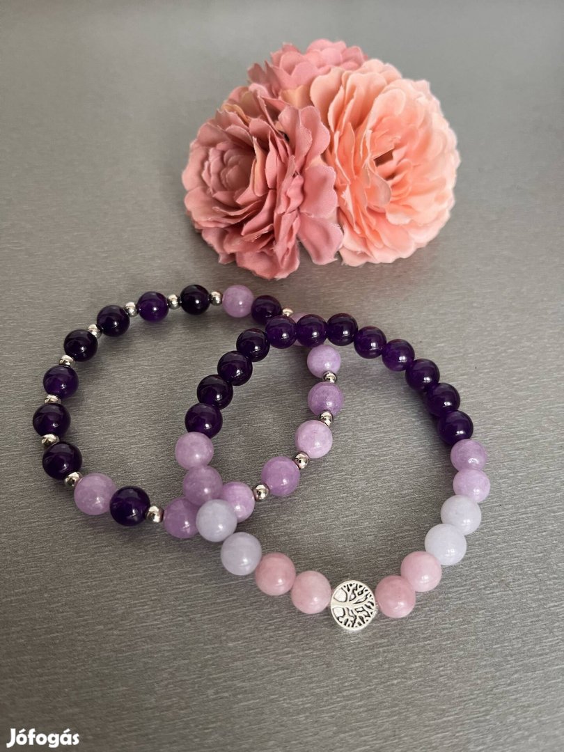 Eladó páros ásványkarkötő,ametiszt,színes morganit és ezüst hematit.Rugalmas damilon 16-18 cm