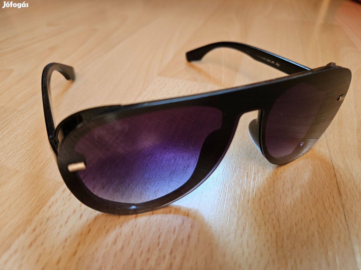 Eladó a képen látható UV szűrős felnőtt unisex napszemüveg. A szemüveg anyaga műanyag, lencséje átmenetes és lila színárnyalatos. A napszemüveg nem új (apróbb kopások néhol lehetnek a száron és a lencsén), de jó állapotú, fix 4,5 eft-os áron vásárolható meg.