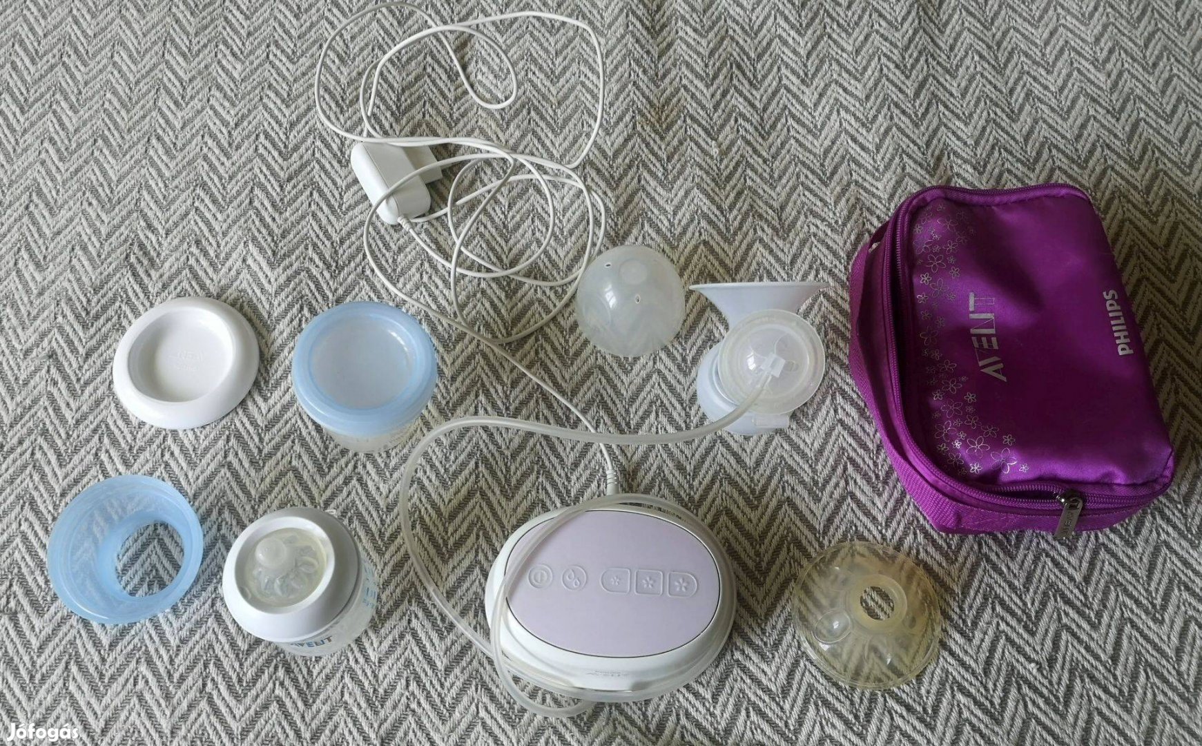 Avent SCF 332 elektromos mellszívó, elemmel és hálózatról is üzemel. Táskával és anyatej tároló flakonnal.