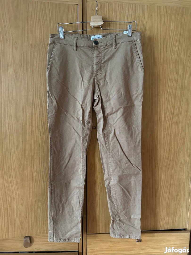 Pier One (Zalando saját márka) férfi chino nadrág bézs/khaki színben, M-es méretben. Slim/tapered szabású, könnyű pamutos szövetből készült- Elöl két oldalsó zseb, hátul két rejtett zseb, övszíj-átvezető. Alig viselt, normál használati nyomok nem láthatók, az anyag struktúrája és színe egyenletes.