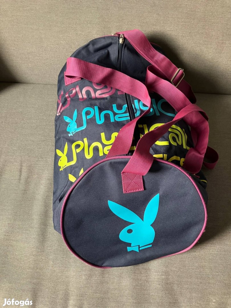 Playboy nyuszis táska, válltáska, sporttáska a képeken látható nagyon jó állapotban helyhiány miatt eladó. Hossz: 53 cm átmérő: 28 cm. Belül 1 kis zseb van.
