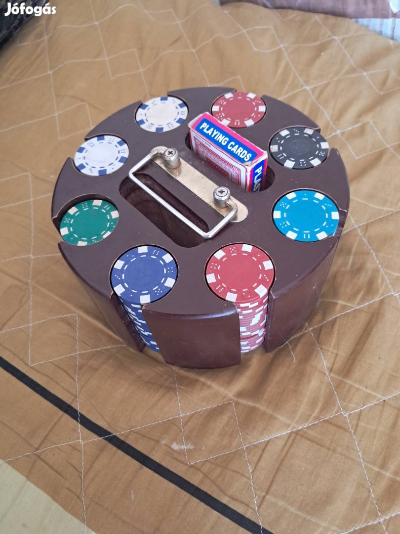 Hordozható póker készlet saját fa dobozában eladó, 20×10cm magas, 8sor, 1-1 sorban 25db, van, különböző színű.