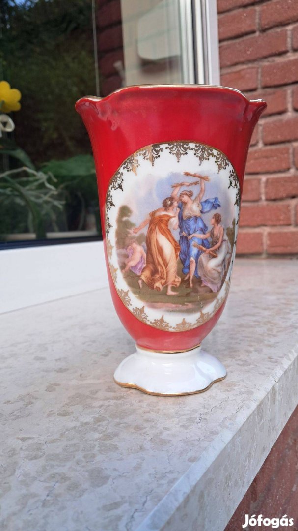 Régi, piros Drasche Budapest porcelán váza allegorikus jelenettel, hibátlan állapotban. Érdekessége, hogy gyártási hibából fakadóan enyhén ferde, emiatt különlegességnek számít.