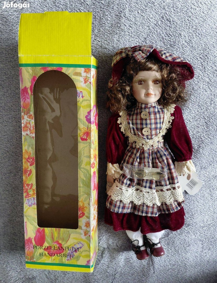 Eladó a fotókon látható tökéletes állapotú porcelán baba, eredeti dobozában, állványával együtt, sosem volt használva.