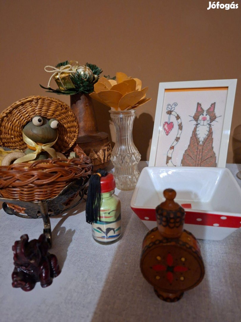 Porcelán figura, nipp, váza, dísz, fésű. karkötő, ezüst medál, táska