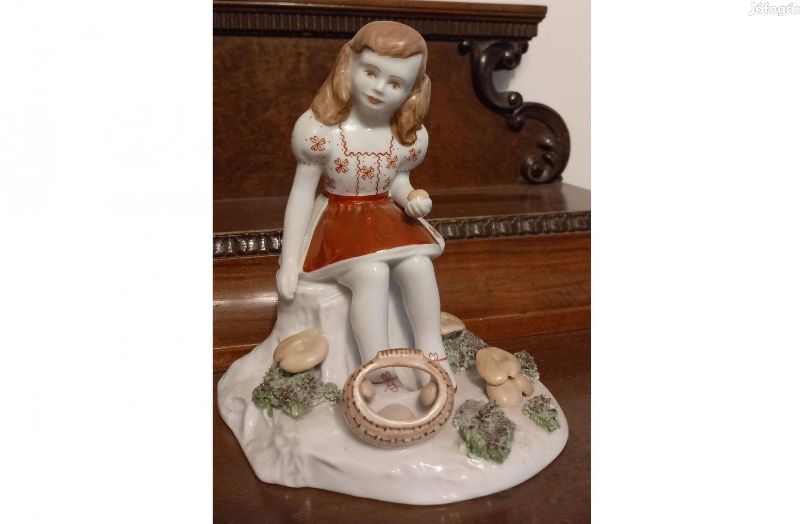 Porcelán gombászó kislány figura, 16 cm magas, Gyulafehérvár
