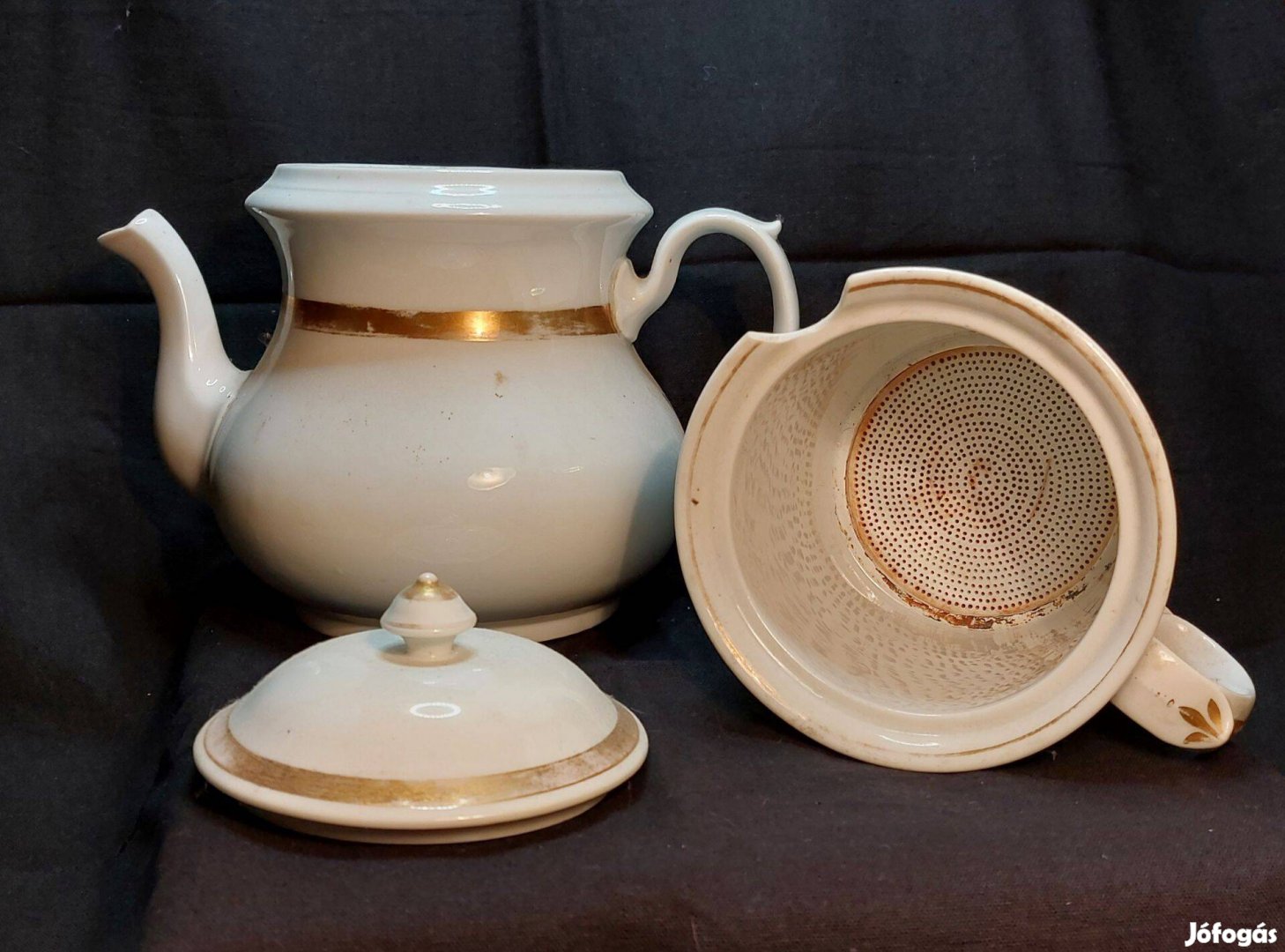 Eladó a képen látható aranyozott szegélyű porcelán teáskanna a hozzá tartozó szűrővel, fedővel.