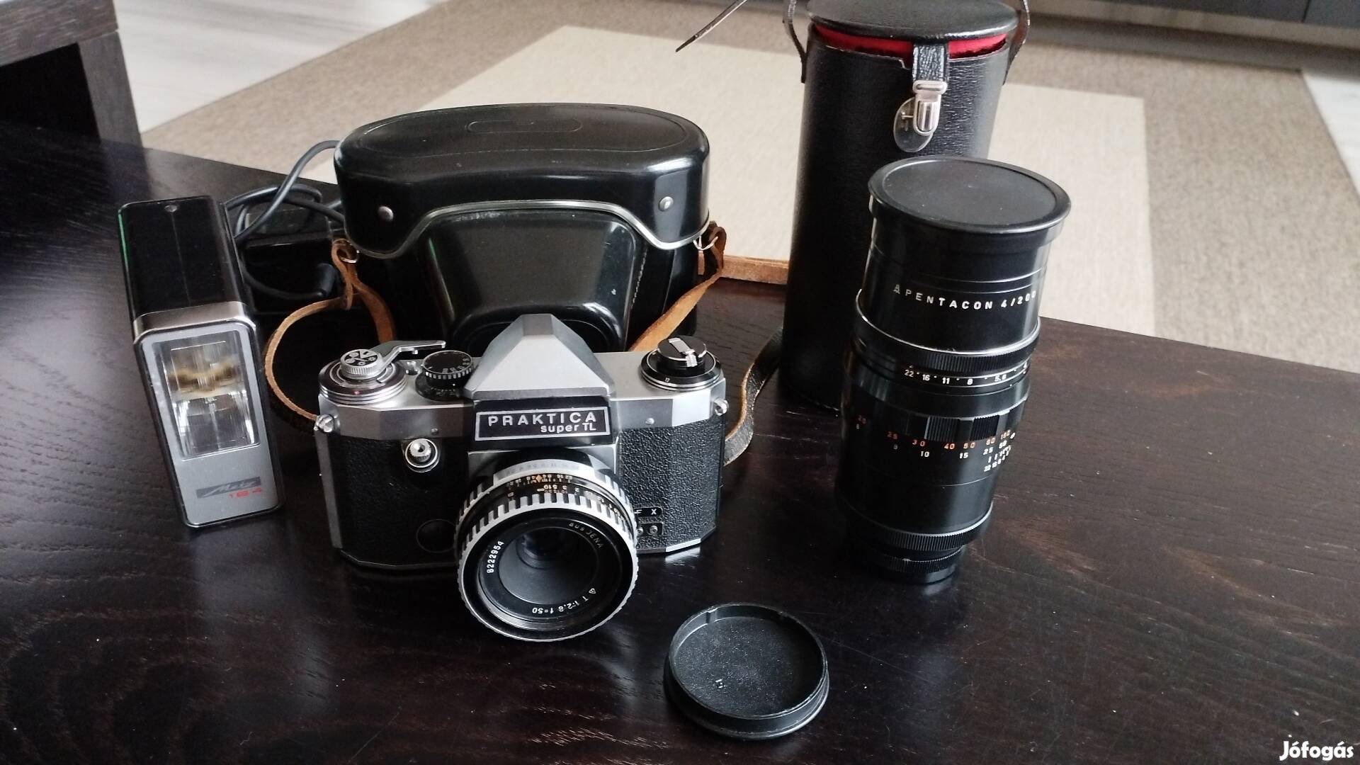 Praktica super TL váz: Masszív fémváz, M42-es csavarmenettel. A záridők lefutnak, a fénymérő elemcserére szorul. Eredeti bőr tokjában.