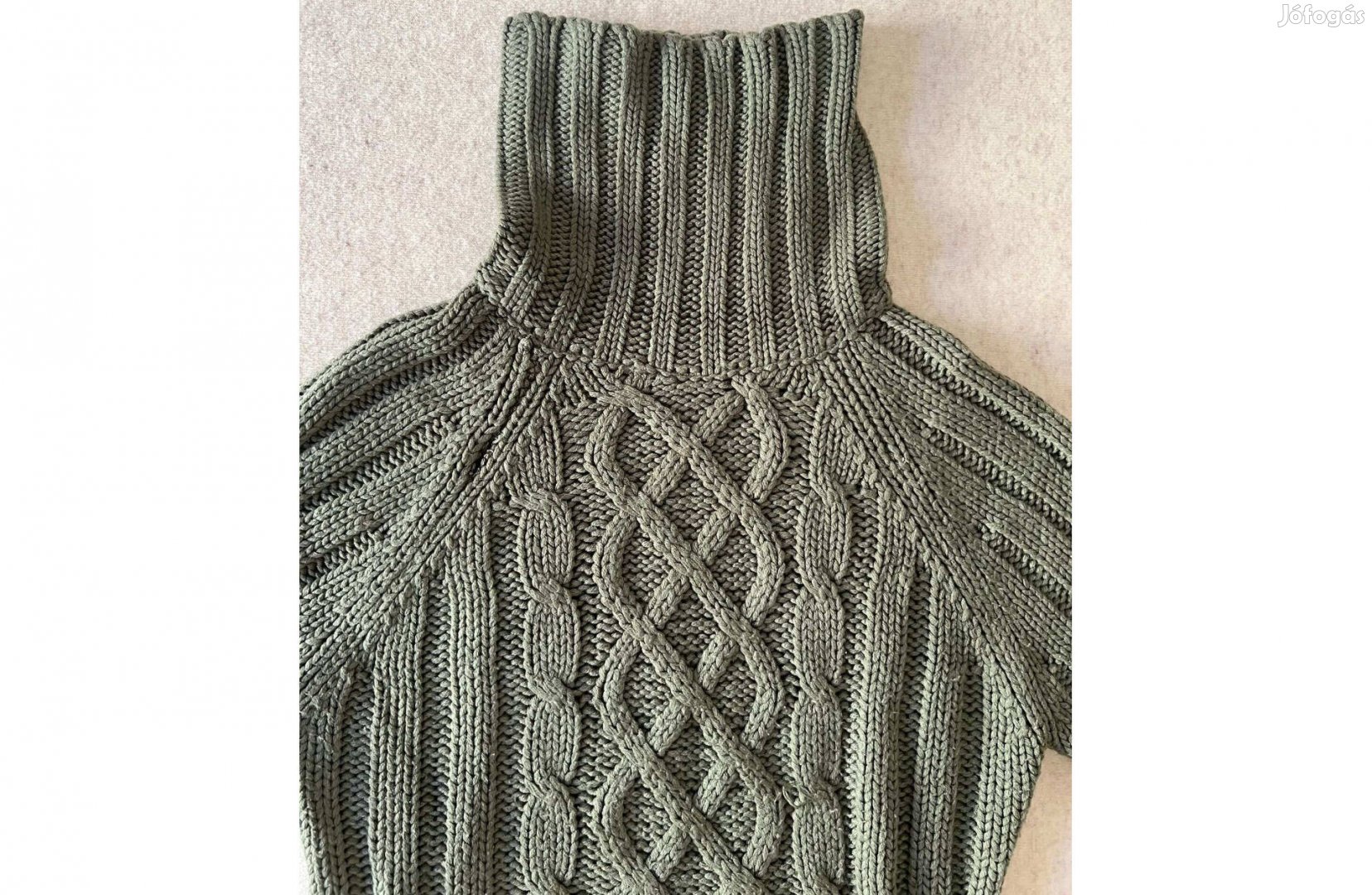 Újszerű kiváló állapotban lévő, magas nyakú, hosszú ujjú, belebújós, egyenes fazonú, elől nagyon szép csavart mintával, nagyon meleg garbópulóver eladó.