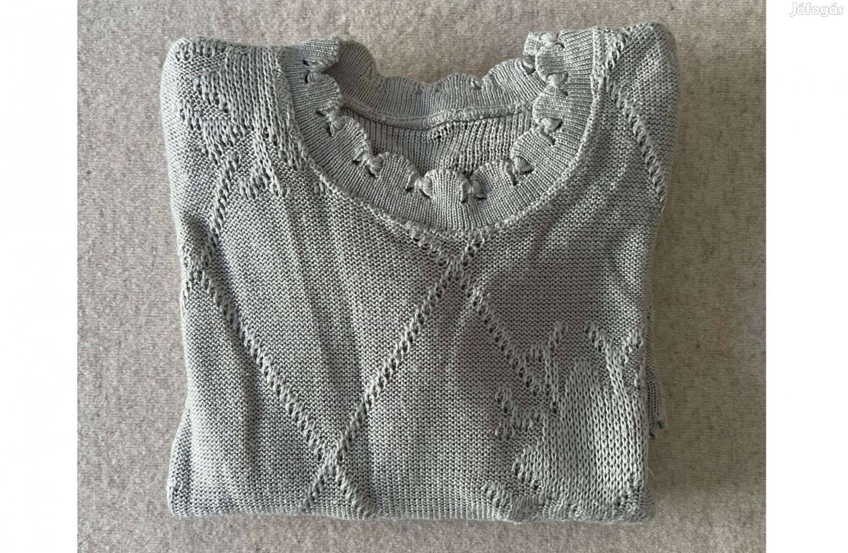 Kiváló állapotban lévő, újszerű női pulóver eladó. Belebújós, környakú, háromnegyedes ujjú, vállában válltömés, ejtett vállú, tunikaszerű, egyenes szabású, finom géppel kötött, csipkemintázatú, mindennapi viseletre.