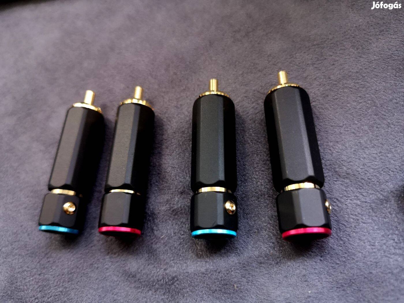 Kihasználatlanság miatt eladó, kiváló minőségű szorítós kivitelű ,RCA dugó .24K aranyozott masszív mag, matt fekete ház,kék piros színmegjelöléssel. A dugó forrasztás nélkül is szerelhető,csavaros de akár forrasztható is.Sokan használják pl Audioquest QED stb kábeleknél ahol nem megengedett a forraszanyag ,hogy az ne módosítsa a kábel hangzását,és ahol a gyártó a kész kábeleinél sem használ semmilyen forrasztást. A dugó típus a Kácsánál ,és több helyen is 5e ft körüli árakon kapható.