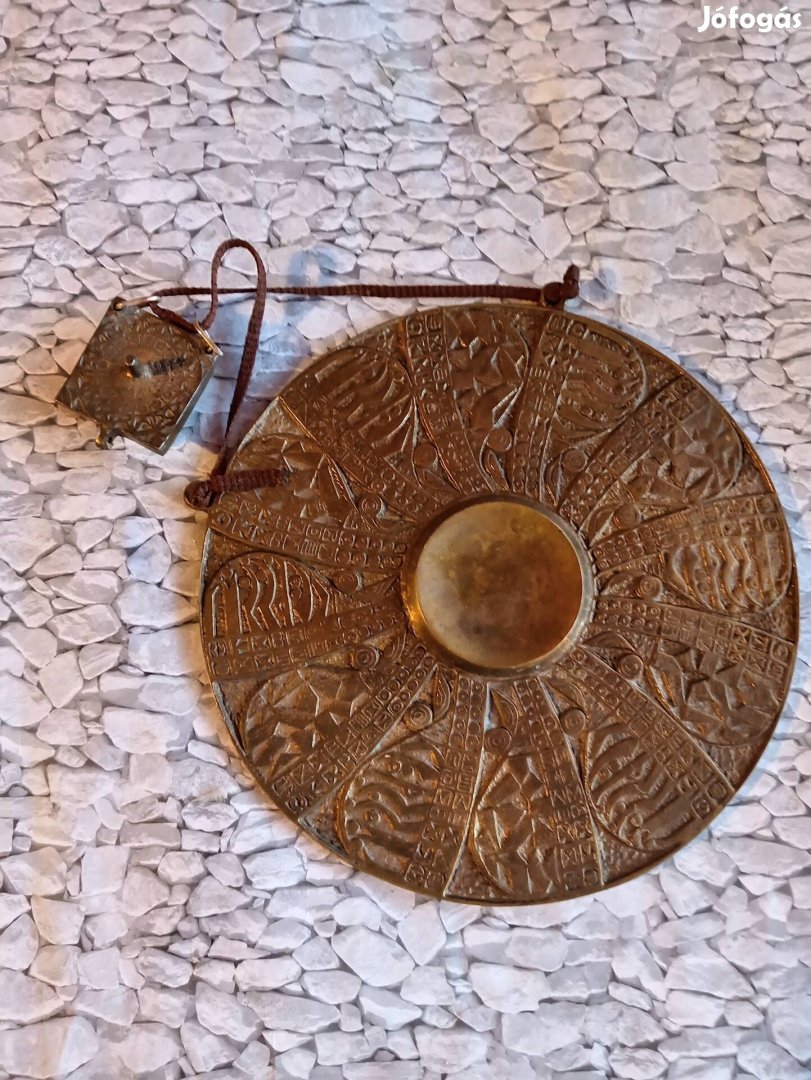 Kiváló állapotban lévő iparművészeti gong, hozzá tartozó gongütő tartóval együtt. Csak személyes átvétel Budapest IV vagy XIII kerületben.