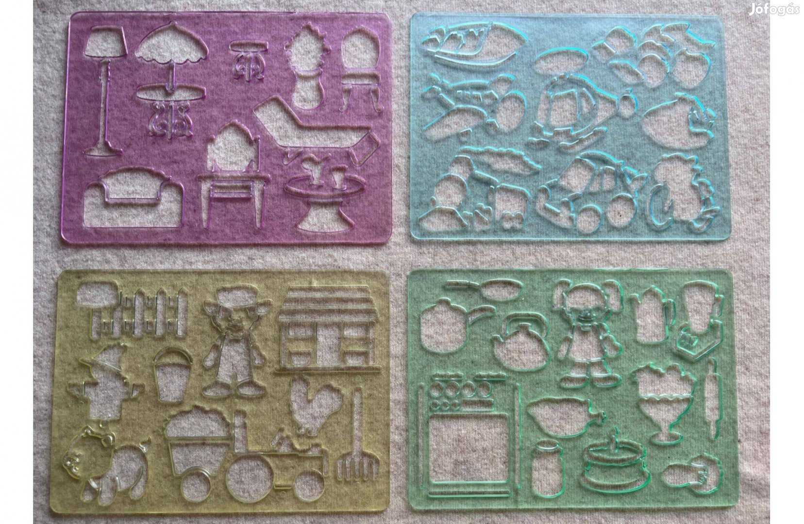 Újszerű kiváló állapotban lévő rajzsablon csomag eladó. Ezekkel a rajzsablonokkal csodaszép rajzokat varázsolhatsz a papírlapokra. Négy sablonon járműveket, konyhai és szobai berendezési tárgyakat, tanyán találat képeket találsz majd. A sablon használata igen egyszerű, hiszen csak a papírlapra kell szorítanod a sablont a mintákat pedig belülről körbe kell rajzolnod. Ha ezzel készen vagy, csak rajzold meg főbb vonalaikat, színezd ki őket és már kész is. Ha igazán kreatív vagy rajzolhatsz köréjük háttért is és teljes a kép.