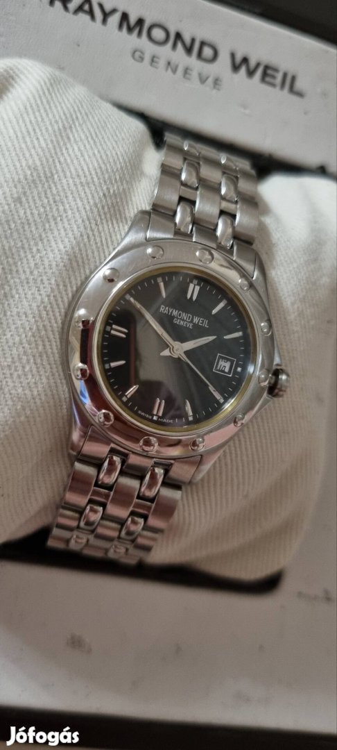 28mm átmérőjű rozsdamentes acél tok, fekete számlap, dátumkijelzés.