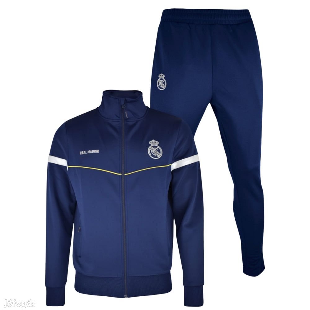 Eredeti / hivatalos Real Madrid termék  Szín: sötétkék (navy) arany részletekkel  Dizájn: arany panel a felső részén, "REAL MADRID" arany felirat a jobb oldalon  Klubcímert: Real Madrid címer a mellrészen  Anyag: 100% poliészter  könnyű, rugalmas és tartós  Komplett garnitúra: cipzáras felső + nadrág  Felső: teljes hosszú cipzár, magas gallér, cipzáras zsebek  Nadrág: elasztikus derék állítható zsinórral, oldalzsebek  Rugalmas mandzsetták és derékrész a kényelmes illeszkedésért  Sokoldalú használat: edzés, utazás vagy elegáns casual viselet  Ideális ajándék minden felnőtt Real Madrid-rajongónak Prémium megjelenés és funkcionalitás egyben  ez a Navy Gold melegítő garnitúra tökéletes választás, ha stílusosan szeretnéd képviselni a klubot.