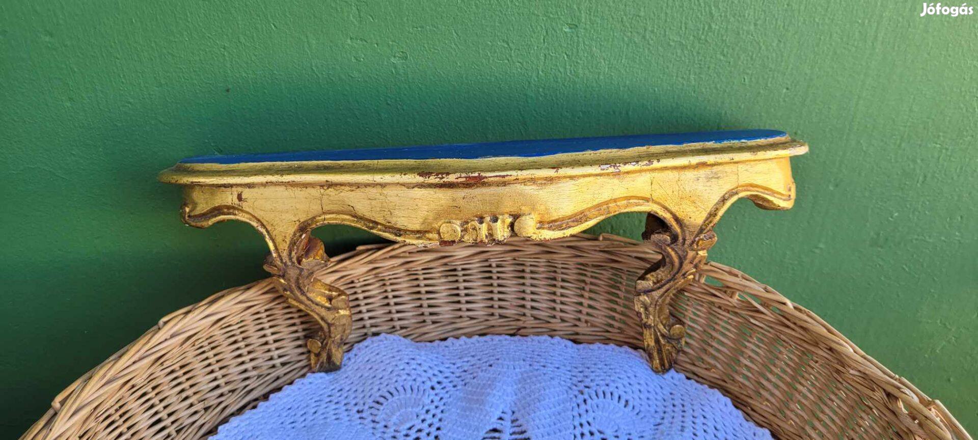 Eladásra kínálom a képen szereplő régi, fából faragott, aranyozott kis konzolt. A képek magukért beszélnek. Körbe fotóztam. Apró lepattanások, egyik lábon sérülés a végén, képeken látszik. Valószínű olasz, az alján számozás.