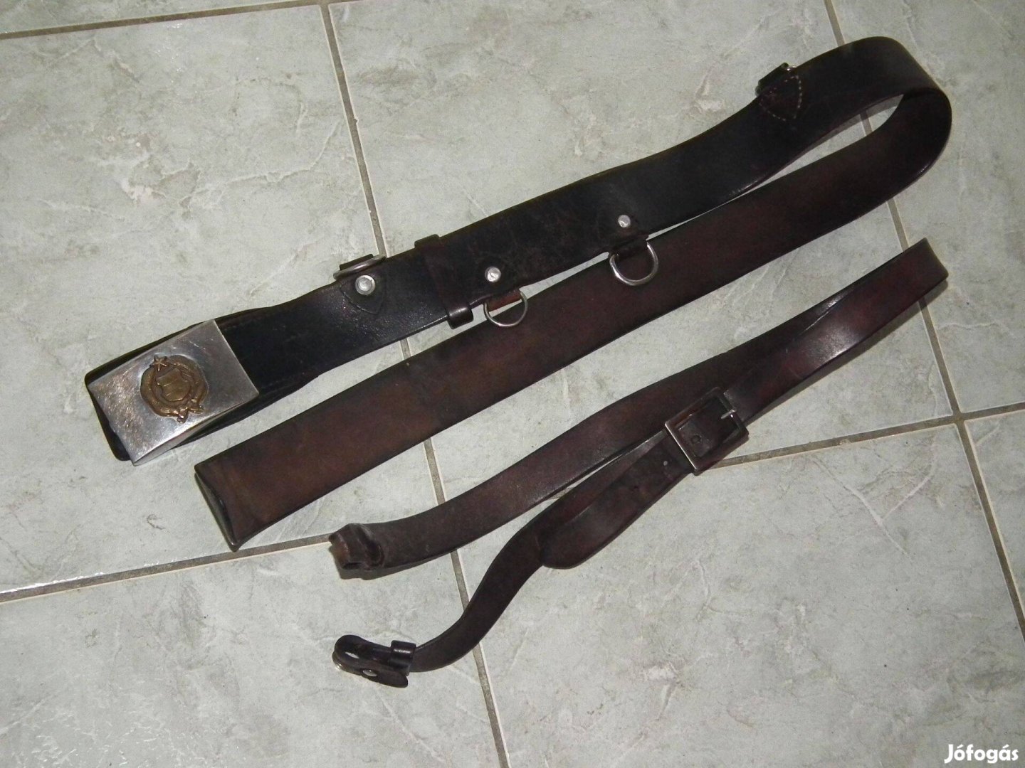 Kádár kori antantszíj katonai öv derékszíj komplett a képeken látható állapotban, valódi bőr. Deréköv teljes hossza 115 cm., szélessége 4,7 cm., vállszíj teljes hossza 110 cm., max. hasznos hossza 101 cm.
