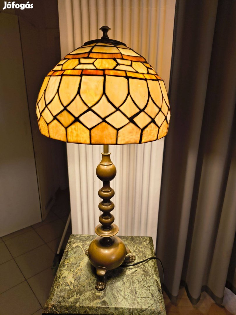 Eladó 83000 forintért a képeken latható régi, antik lámpatestű asztali lámpa. A lámpatest Stiffel lámpa szerű, (jelzést nem találtam rajta, benne), minőségi bronz tojásformákkal, réz foglalatokkal. A lámpabúra modern, tiffany tipusú üveg búra. Nagyon szép fényt ad! Át van vezetékezve, azonban a vezetékezés szakemberrel történő ellenőrzése minden vásárolt használt lámpánál ajánlott! Átvehető a 4. kerületben. Nem postázom!