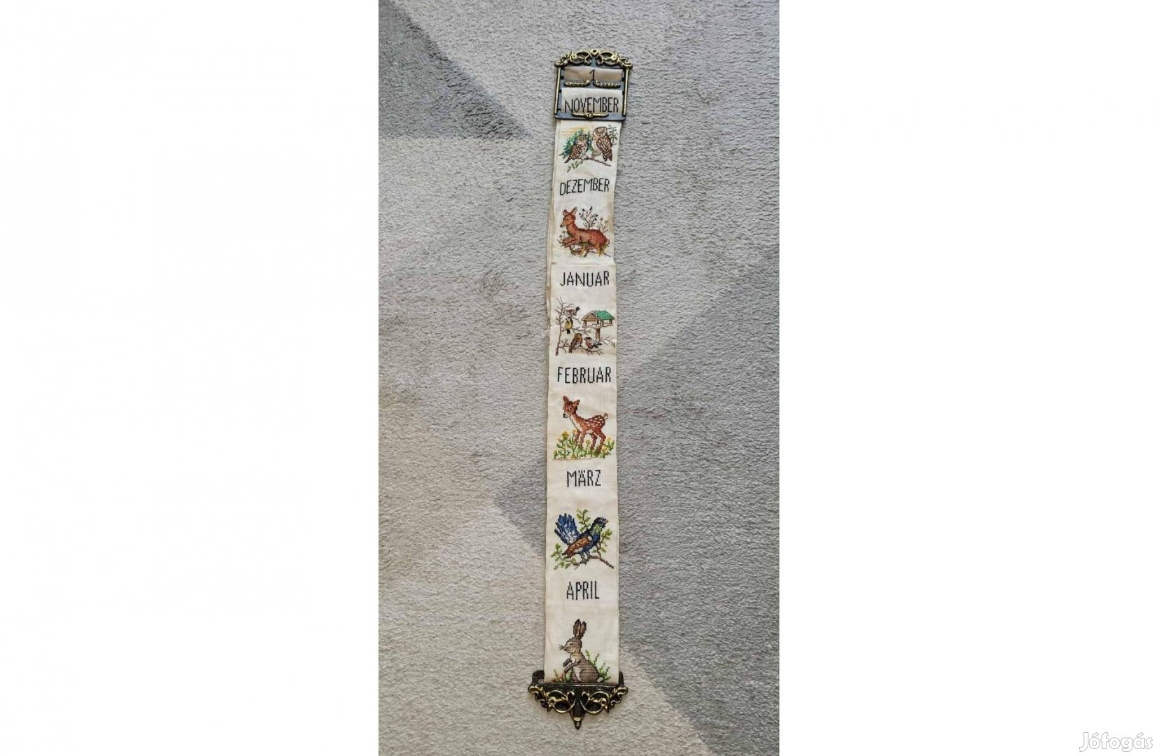 Eladásra kínálom a képen szereplő régi falra akasztható tűgobelin öröknaptárt. A képek magukért beszélnek. Körbe fotóztam. Ritka, különleges darab. Tisztítani kell és sajnos egy kis részen javítani is, fotóztam. A réz vagy bronz tartozékok szép díszesek, mágnes nem fogja.