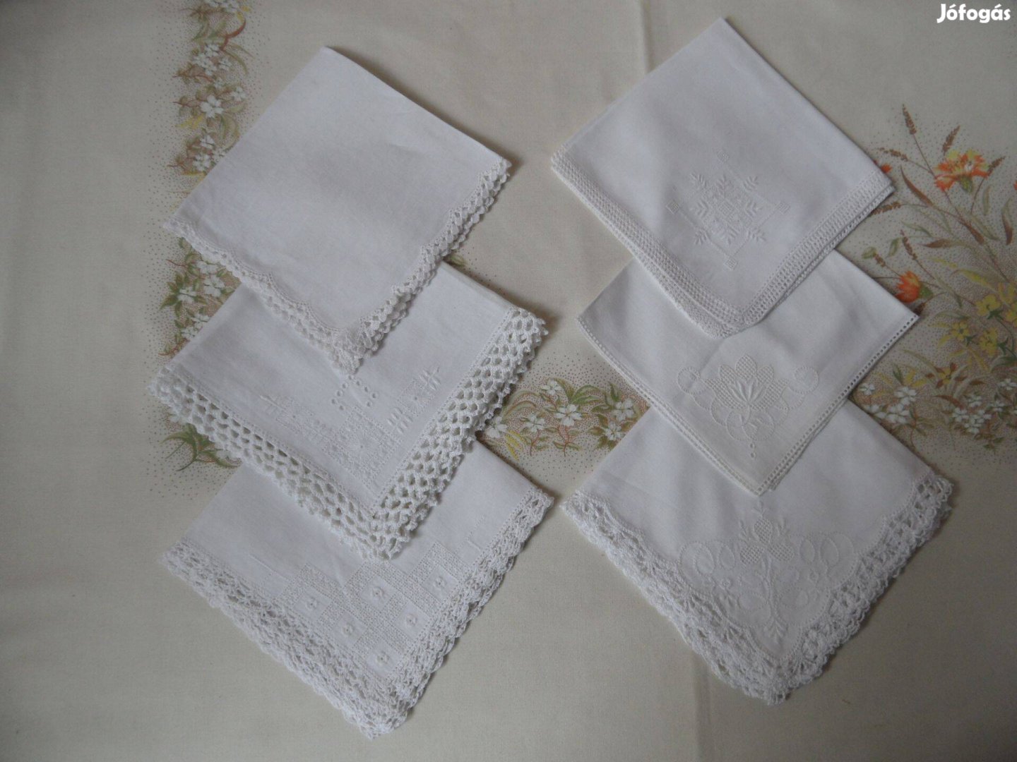 A képen látható 6 db. hímzett, csipkeszegélyes díszzsebkendő szép állapotban egyben eladó.