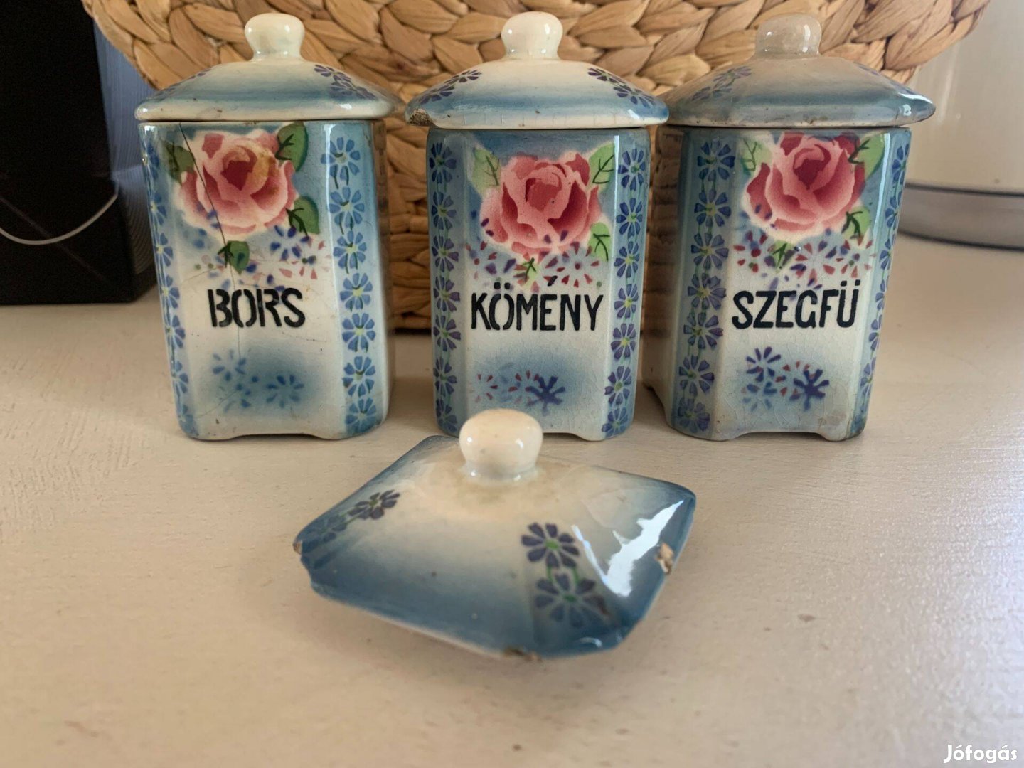 Nagyon régi fűszertartók tetővel (+ 1 tető), méretei: oldalak 5x5 cm, magassága tető nélkül 8 cm.