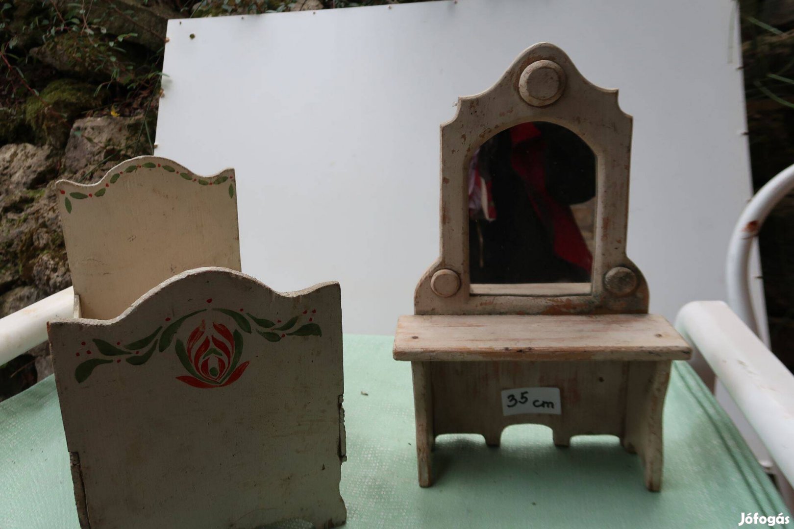 Régi játék fabababútor: ágy és fésűlkődő tűkőr 35cm