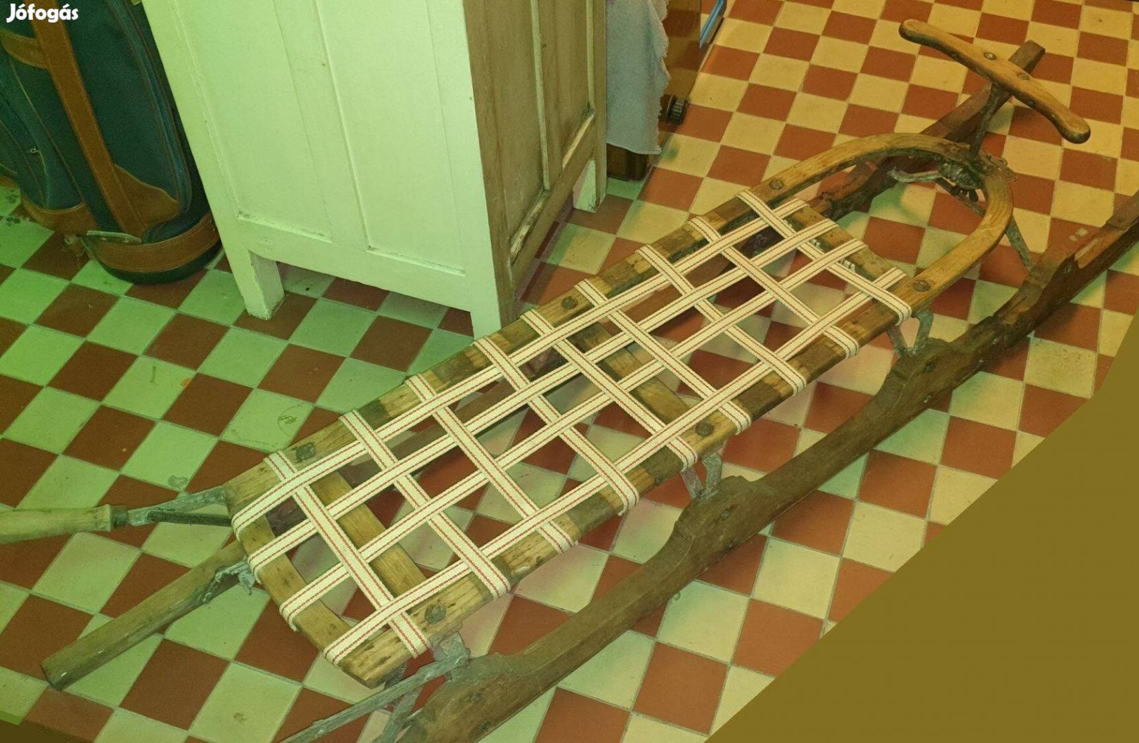 Régi kormányozható nagy szánkó. Legalább 80-100 éves szánkó / szánkóbob / bob szánkó. Strapabíró, masszív fa darab, fém alkatrészekkel, fonott ülőfelülettel (~96x33cm) és eredeti, felszerelt fékekkel. Ívelt fa orr-résszel és T-alakú kormányrúddal. Méretek: hossz ~193cm, szélesség ~40cm, magasság ~22cm [a kormánynál ~38cm]. A kormány rész működik, kanyarodik. A hátulján a jobb oldali markolat hiányzik. Képen látható fellelt állapot. Ritkaság!