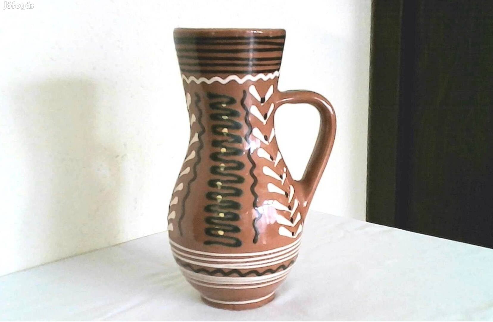 Régi népművészeti szép festett mázas kerámia bokály korsó
