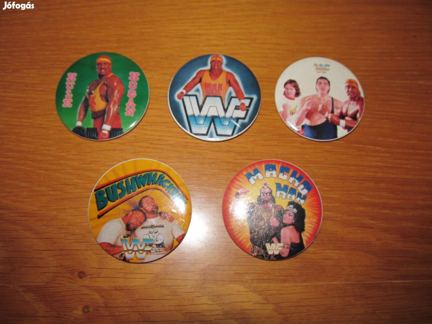 Régi trafikos pankrátor kitűzők: Hulk Hogan, Macho Man, stb. (WWF)