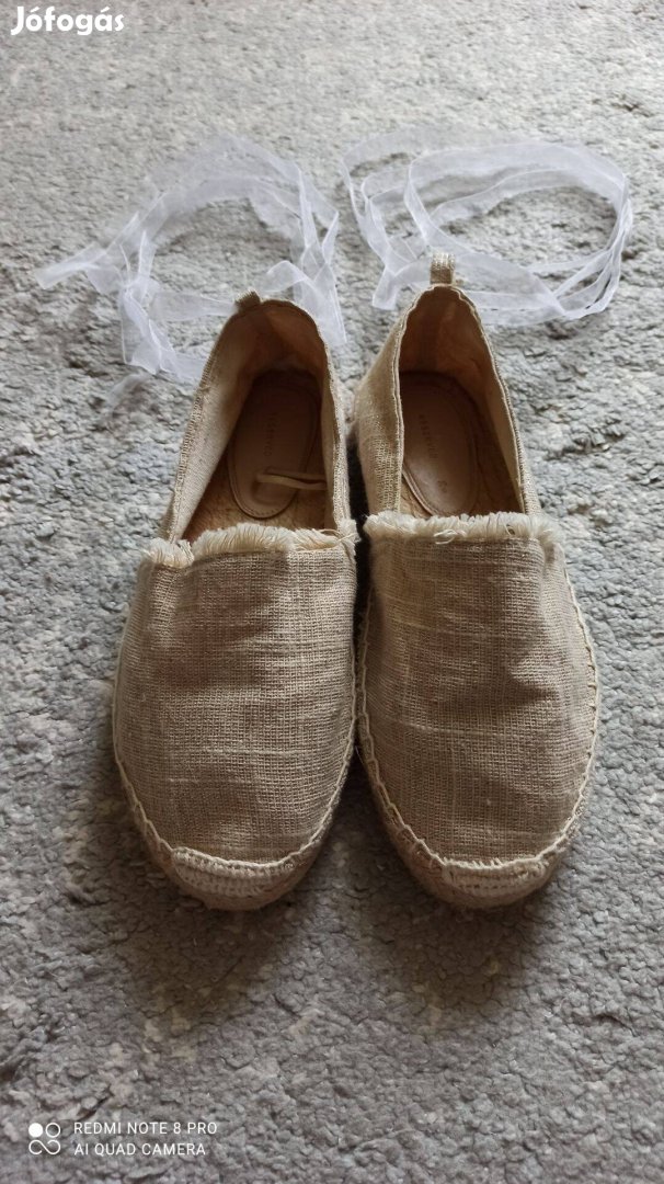 Reserved natúr színű csillogós espadrilles cipő, loafer, belebújós cipő, szalaggal fel kell kötni a lábszárra, szélesebb lábra ajánlom, 39-es méretű, új állapotú 3500 Ft-ért eladó.