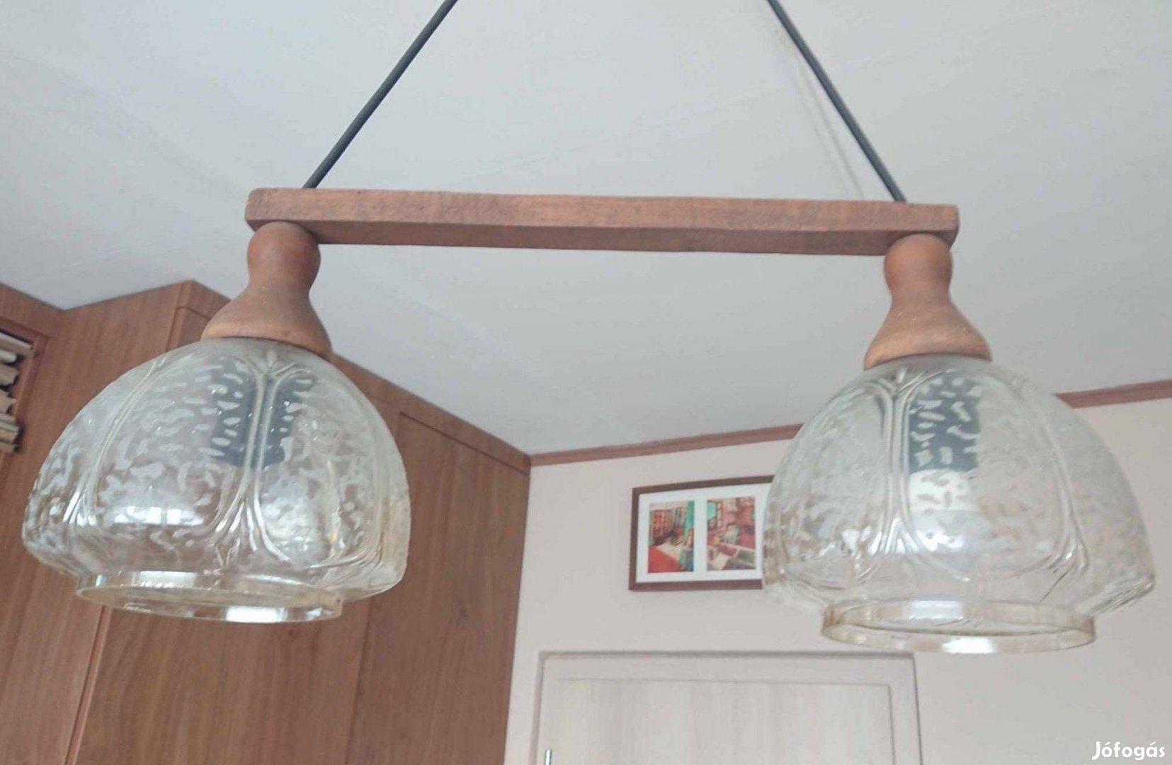 Eladó! Megkímélt állapotban, működőképes, Retro 2 ágú mennyezeti csillár fa alappal, üvegburával a csillár hibátlan.