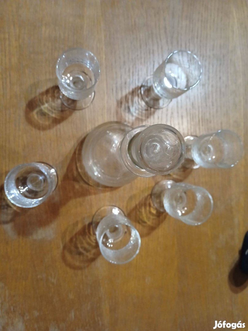 Retro , üveg , pálinkás , likőrös készlet ( 7 darabos, 6 kis talpas pohár és egy italtartó tetővel )