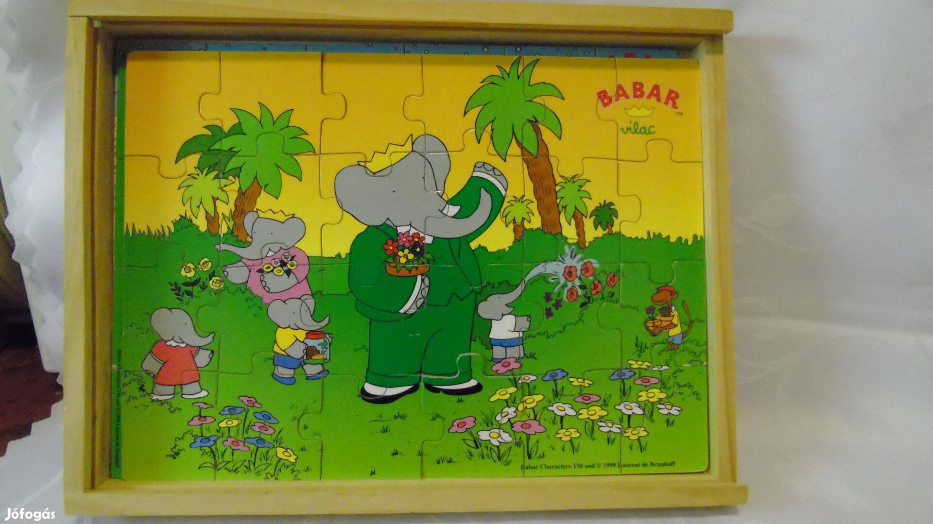 Retro Vilac Babar témájú puzzle 3x24 darabos fa dobozzal 1999