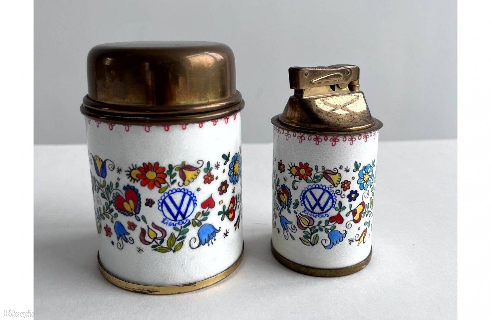 Eladó retro, vintage Volkswagen festett, zománcozott, fém cigarettatartó és öngyújtó szett. korához képest nagyon szép állapotban van, ahogy a képeken is lehet látni. A festés nem kopott, nincs rajta repedés, karc- és törésmentes. Akár ajándéknak is tökéletes.