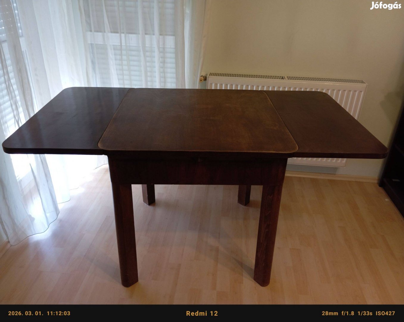 Retro kihúzható, tömör fa étkezőasztal, Mérete összecsukva 77,5*77,5 cm, kihúzva 148*77,5 cm, magassága 75 cm