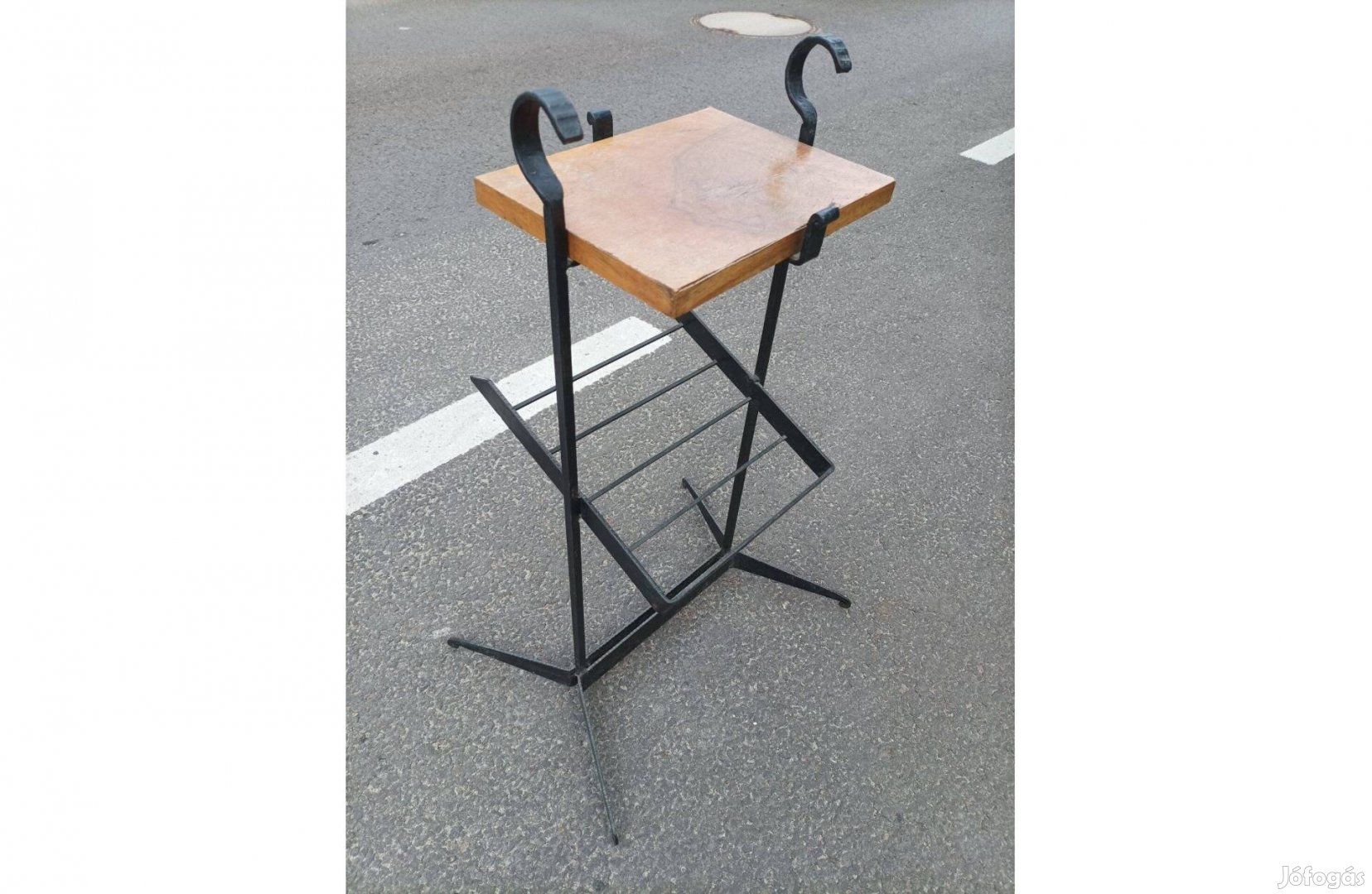 Kovácsoltvas szerkezetű, lerakó asztalka. Ideális kislámpa, telefon vagy dekorációs tárgyak elhelyezésére. Az asztallap alatt található rácsos rész kifejezetten folyóiratok és napilapok tárolására szolgál. Képek szerint, fém váz festést, fa rész csiszolást igényelhet. Átvehető Zuglóban.