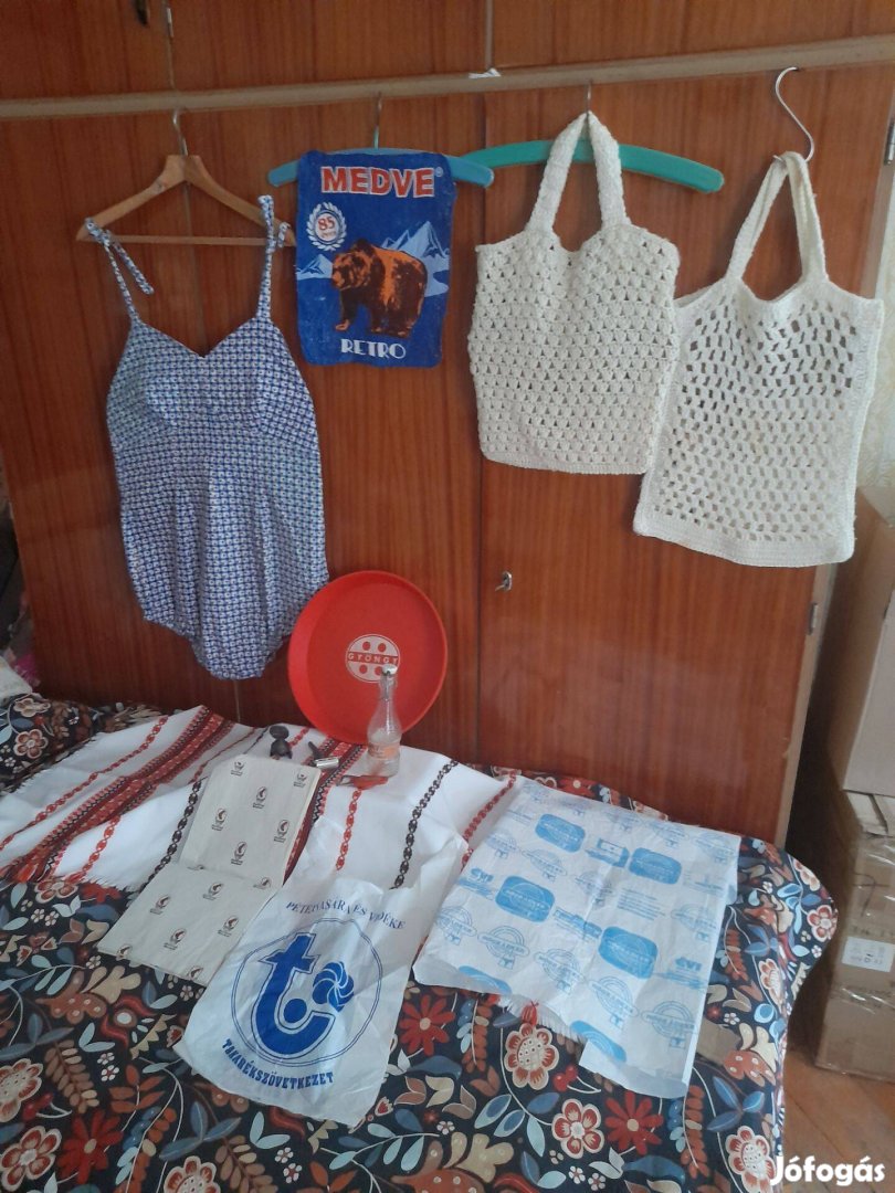 Eladó vegyes retro dolgok eredti Bambis üveg két raffia szatyor egy 50-es évekbeli fürdőruha dressz stb Budapesten belül ingyenesen kiviszem ,vidékre postázom Tel számom Dani