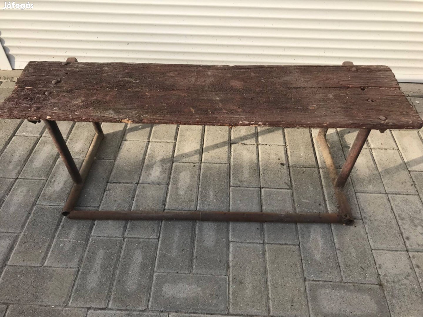 Eladó retro kerti pad, ülőke és szék, erős, masszív vas lábakkal. A faanyagot érdelemes cserélni, vagy festeni.