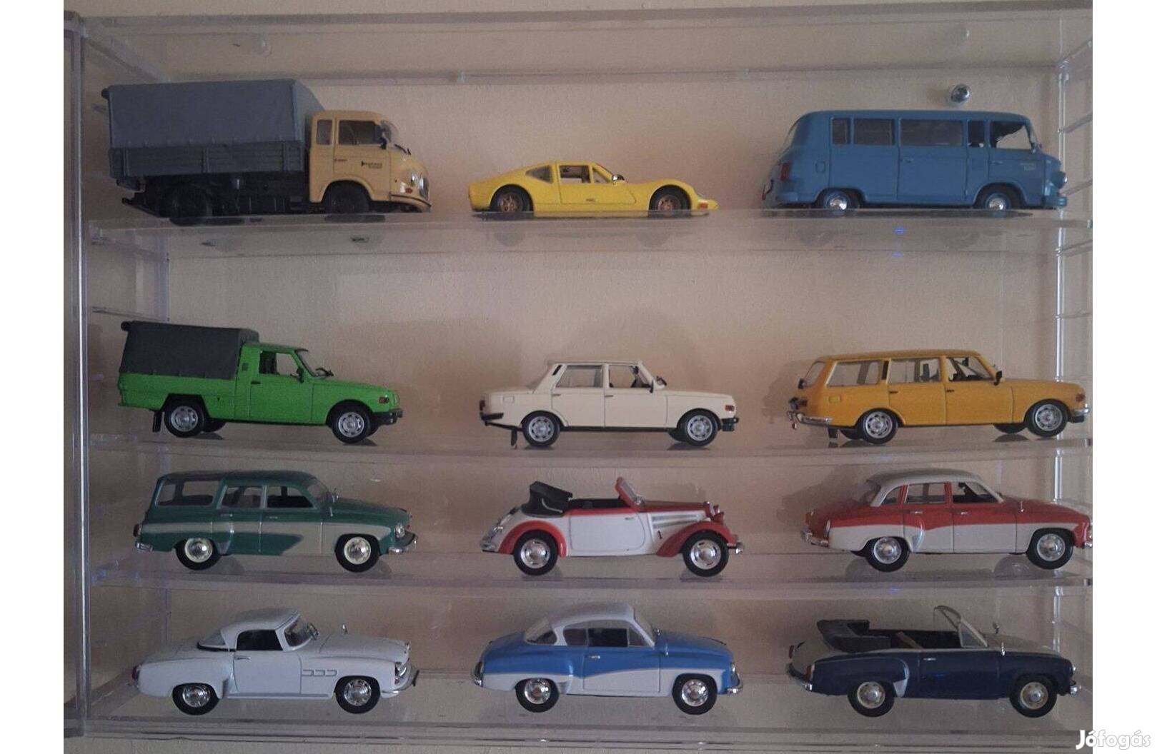 12 db KGST modell 1:43 méretben műanyag falivitrinben. NDK téma: Barkas, Melkus, IFA, Wartburg. A vitrin mérete 40 x 36 x 8 cm.