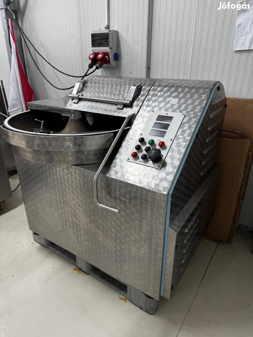 Eladó a képeken látható professzionális ipari keverő/dagasztógép. Masszív, rozsdamentes acél kivitel, nagy teljesítményű berendezés, amely kiválóan alkalmas húsipari, pékipari vagy egyéb élelmiszeripari felhasználásra.