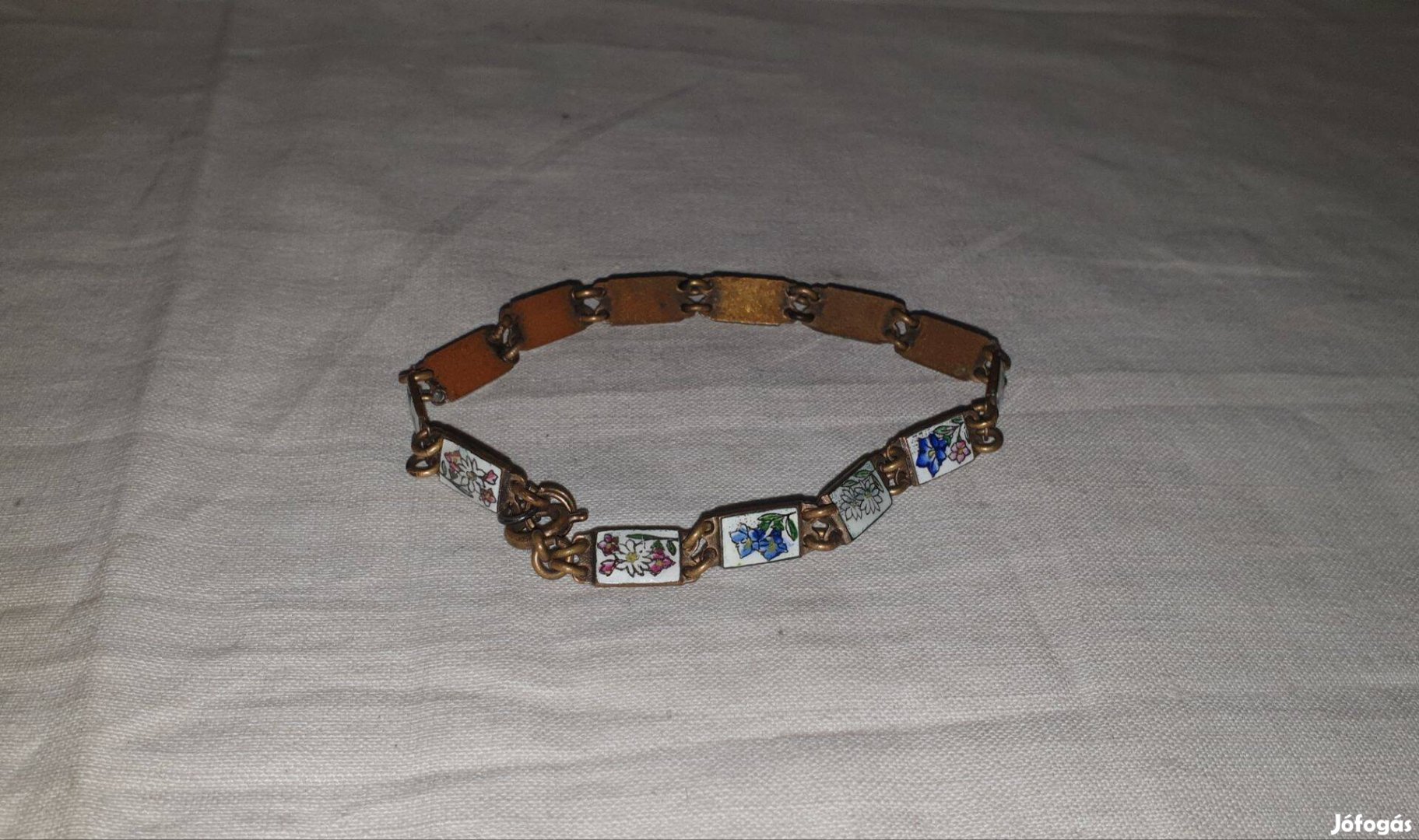 Réz karlánc tűzzománc díszítésekkel. Legalább 60 éves gyártás. Réz alapú karkötő/karlánc, tűzzománc betétekkel. A betétek kézzel festett, színes, virág motívumokat ábrázolnak. Egyszerű klipszes nyitása van, jól működik. Súlya: ~8.9gr. Teljes hossza: ~20cm. Szélessége: ~6mm. A tűzzománc betétek mérete: ~9x6mm. Szép állapotban. Remek ajándéktárgy!