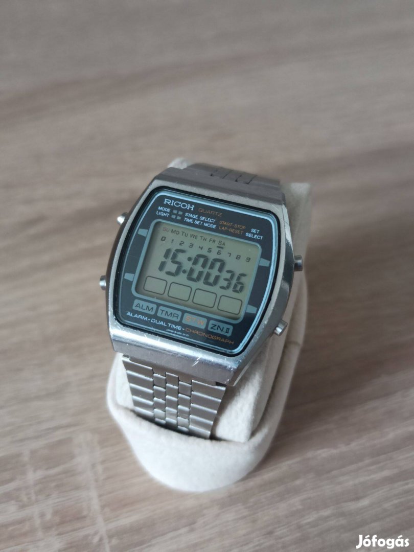 Pontosan működő, új elemmel szerelt LCD kijelzős Ricoh karóra eredeti jelzett csattal. Funkciói működnek. Az eredeti csat teljes hossza már nincs meg, ezért jár hozzá egy másik, ugyanolyan fazonú és szélességű csat pótlásra. Mérete gombok nélkül: 35,6 mm x 37,7 mm.