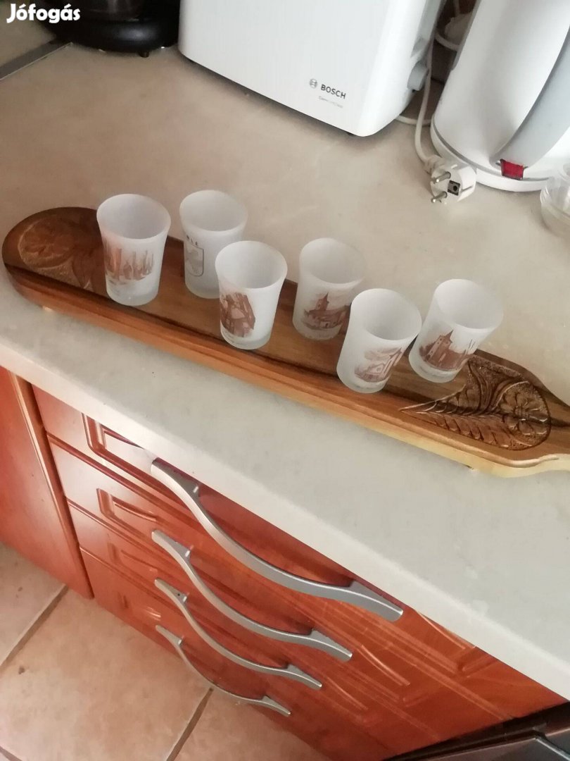 Ritka népművészeti faragott fa alapon, tejüveg pálinkás készlet 50 cm