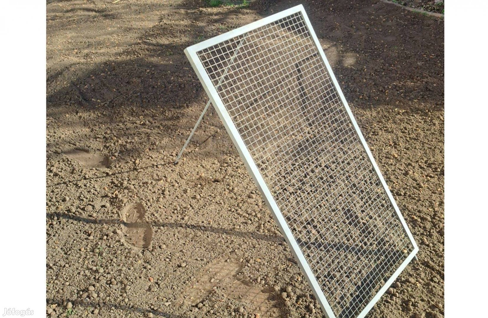 3 lábú, dönthető, 2x2 cm es lyukméretű. A teljes keret pedig 50x100 cm méretű.