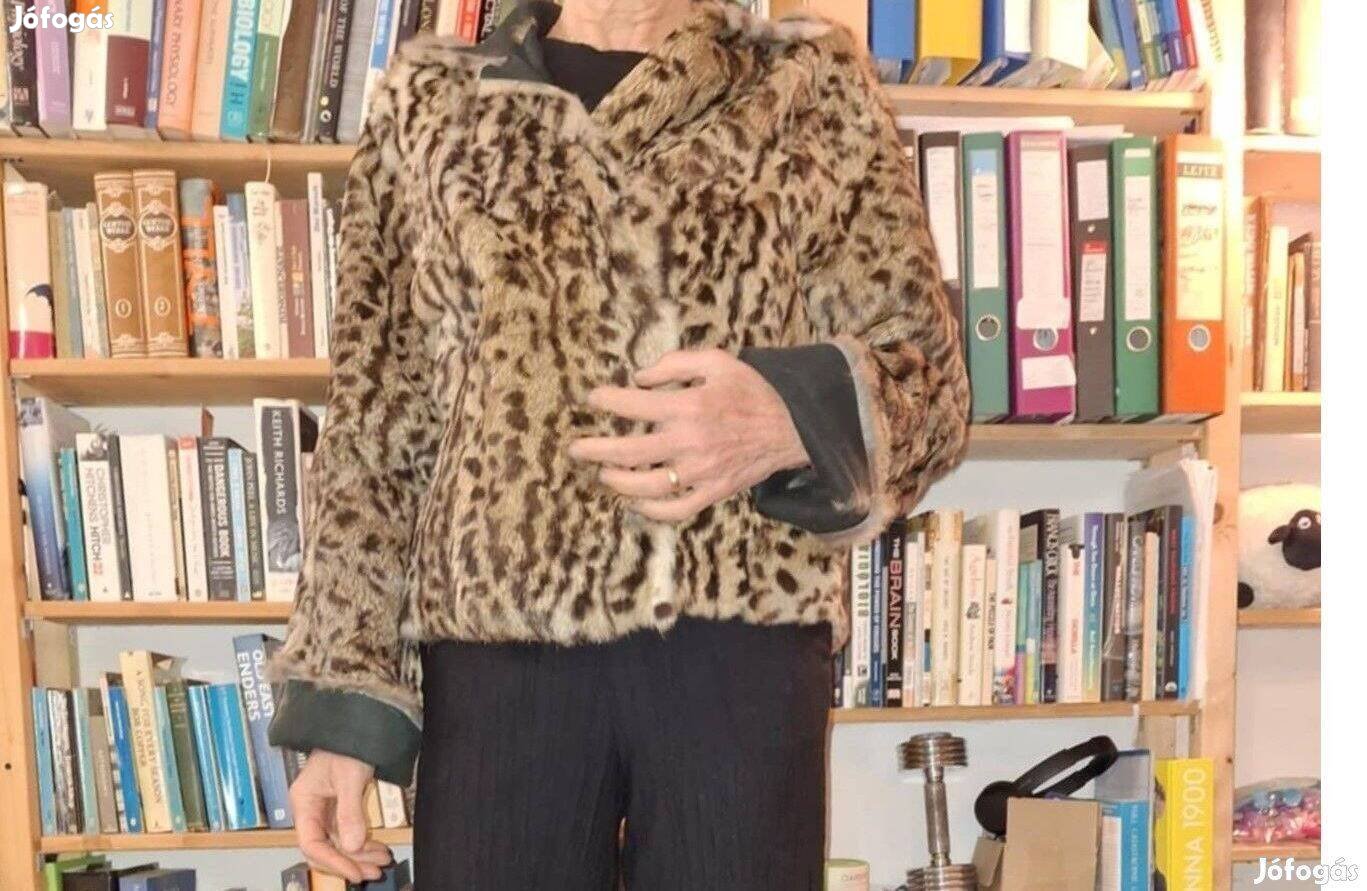 Rövid, béleletlen kabát, zseb és cimke (márkajelzés) nélkül. Szabályos szőrmedarabokból, géppel varrták össze. A varrás a prémes oldalon nem látszik. A szőrme kiváló állapotban van, egyáltalán nem hullik. Mind fekete felével, mind prémes felével kifordítva viselhető. Eredete nem bizonyítható, de a valódiságához nem fér kétség. (Nem festett nyúlprém, ld. közeli képek.) Jó meleg, de van alatta hely egy vastagabb pulóvernek is. Kb. 40-es méret. Nagy valószínűséggel ocelot bőréből készült, így az is valószínű, hogy igazi vintage darab, kb. 40 éves.
